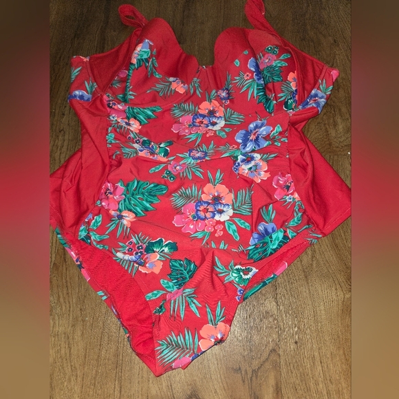 The Old Navy 4X Red Hawaiian Tropical Floral Bathing Suit is a plus-size women's swimwear featuring a vibrant red floral pattern inspired by Hawaiian theme. With its brand name being Old Navy, this bathing suit is designed for women looking for a stylish and comfortable swimwear option. The larger size of 4XL ensures a perfect fit for those who need it. Perfect for a day at the beach or pool, this bathing suit is sure to make a statement with its bold red color and tropical Hawaiian print. Great for a cruise, Caribbean or vacation.