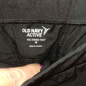 Old Navy Active Hybrid Pants in a M. They are in excellent condition and the color is black. The waist is elastic, and there are side and back pockets. These pants are versatile and can be dressed up or down.
