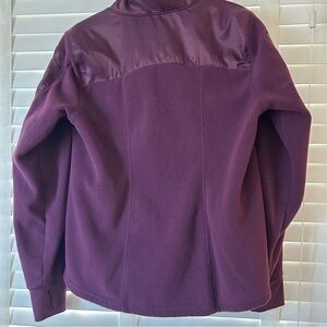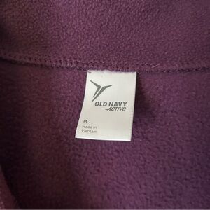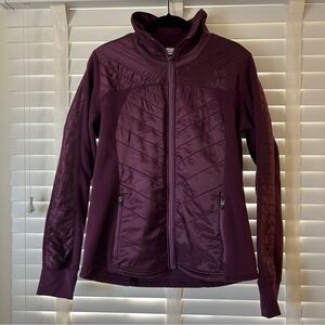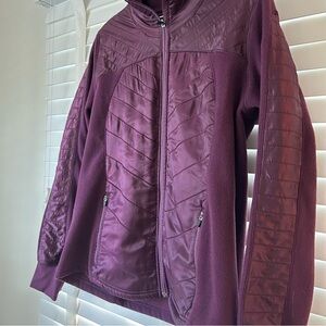 Old Navy Active women’s jacket with purple puffer detail and fleece sleeves and lining. Athletic, athleisure style with two front pockets and a front zip. Cute for running and exercise!