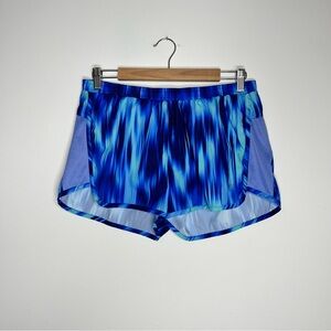 These Old Navy athletic shorts feature a vibrant blue color scheme with a dynamic vertical striped pattern that creates an energetic look. Made from lightweight moisture-wicking material, they offer a comfortable fit with an elasticated waistband, perfect for active wear. Semi fitted. Size medium. Lined. Drawstring.