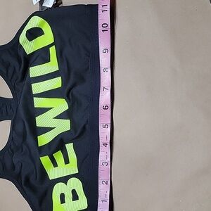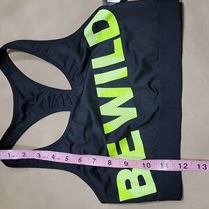 Old Navy Active Size S Black with Neon Green "Be Wild" Spellout Sports Bra, NEW with Tag. Medium Support. Racerback. Pullover Styling. Please refer to measurements in photos to ensure proper fit.