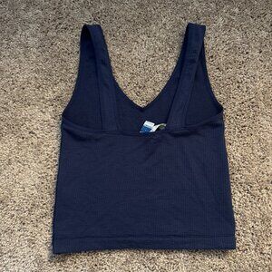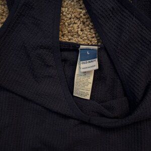 Breathable navy blue performance tank with a textured finish and deep V-neck front and back. Features a sporty racerback cut and wide straps for secure, comfortable movement. Great for layering or wearing solo for low-impact workouts or casual days.
