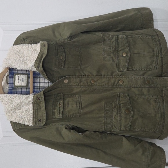 Old Navy Army Green, Flannel Lined Button Up Jacket with Sherpa Collar Size L,,Great condition, Actual Measurements are