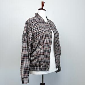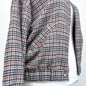Size Large Old Navy Bomber Jacket. Plaid houndstooth fabric in autumnal colors. Snap front closure. Front welt pockets. Elastic cuffs. Great condition!