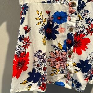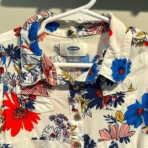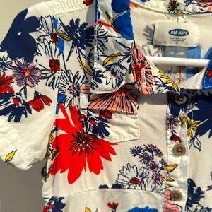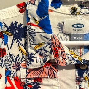 Old Navy sundress, like new condition only worn once. Baby girl/toddler size 18-24 month. Fun, summery floral print on this collared dress makes it easy to dress up special occasion or can be worn as simple sundress for everyday. Buttons all down front for easy on and off and the white flowy dress has pops of color in red, pink, blue, navy and yellow. Back has elastic at midsection to add some stretch.