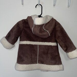 This Old Navy coat, designed for babies aged 6-12 months, offers warmth and style. The brown faux suede exterior is complemented by a soft, white sherpa lining, providing both comfort and insulation during cooler months. The hood and button pockets add functional details for added convenience.