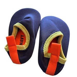 These charming baby walker shoes from Old Navy feature a deep blue body with vibrant orange straps for a secure fit. Designed with a soft, flexible material, they ensure comfort and ease for little feet. The wide opening allows for easy slip-on and removal, making them perfect for your child's first steps.