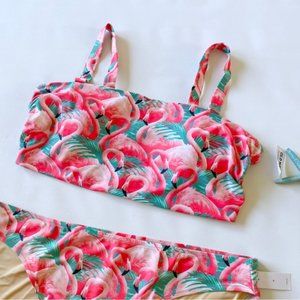Bandeau Bikini 2-Piece Swim Set for Women in the color Flamingo Fun, a repeating print of pink flamingos and tropical leaves throughout.