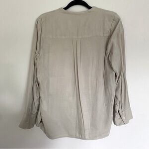 This beige blouse from Old Navy showcases a relaxed fit with a subtle textured woven cotton blend, providing both comfort and style. Its long sleeves and soft fabric make it a versatile piece for various occasions, effortlessly combining casual elegance. This blouse features a split V-neckline with a center pleat, classic style button cuffs, and a curved tunic style hem.