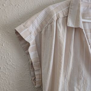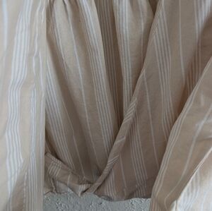 Stylish wrap blouse with beige and white stripes, faux short sleeves with cuff, and flattering tie detail.