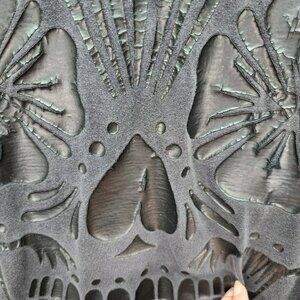 This black t-shirt features a striking cutout skull graphic design, offering a bold yet stylish aesthetic. Constructed from 100% cotton, it ensures comfort and breathability for everyday wear.