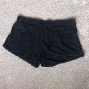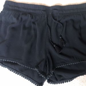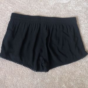 Old Navy black shorts with drawstring and elastic waistband. Fabric is 100% rayon (super light & comfortable, but wrinkles somewhat easily).
