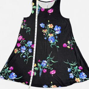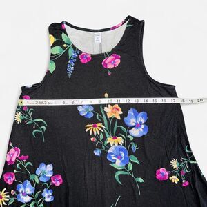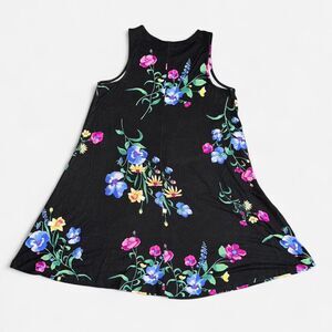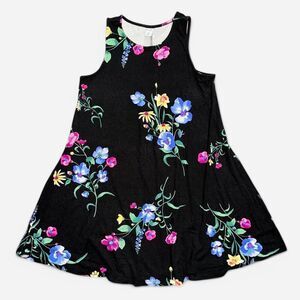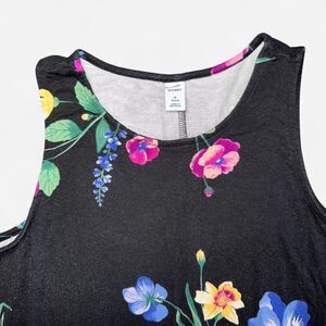 Black mini dress with multicolored floral print in size WOMENS MEDIUM PETITE from Old Navy. Sleeveless, soft, t-shirt material.