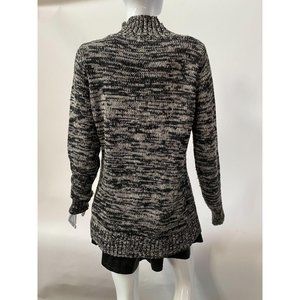 This sweater is perfect to keep you warm during teh cooler months. It has a mock turtleneck neckline to keep you warm. It is a size medium and the measurements are: Armpit to armpit 21″ Shoulder to hem 30″ Shoulder to shoulder 15″ and a sleeve length of 27″