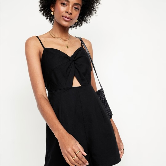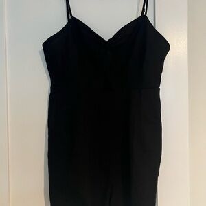 Stylish black jumpsuit with a front knot detail. Sleeveless design, adjustable straps and smocked elastic back. Perfect for any occasion. 2.5” inseam. Currently on sale online for $20. Never worn but tags removed.