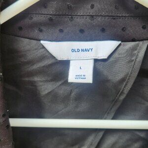 Made by Old Navy. Heavy black, tone on tone black polka dot, blazer. Size L. Preowned. In great condition. Made in Vietnam. One button front. Two outside pockets. Polka dots are velvet like. Cotton blend.