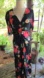 Romantic black dress with vintage influence. Retro floral print in red and pino. Elbow length sleeves with ruching accent. Ruched bodice. Flowy lower. Elastic at waist rear. Size large. Pre-owned no flaws.