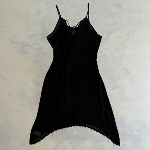 -Details: black, sheer, tassel tie on back of neck, asymmetric hemline, in great pre-loved condition