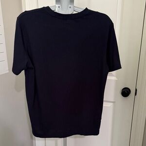 Navy blue short sleeve tee with Santa driving a hot rod. Fun and festive graphic. Great for holiday spirit.
