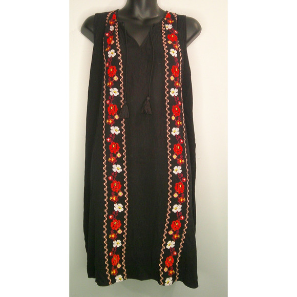 Old Navy Black Sleeveless XXL Embroidered Floral Shift Dress Tassels Boho Aztec