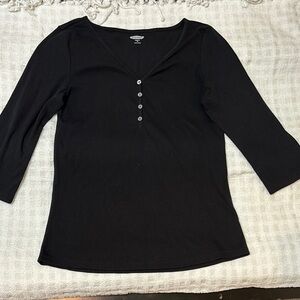 Okd Navy black blouse with a flattering V-neck. Features stylish button accents. Removable stain on back.