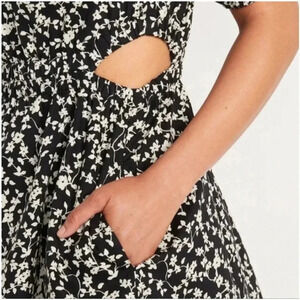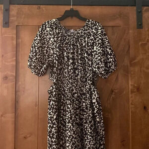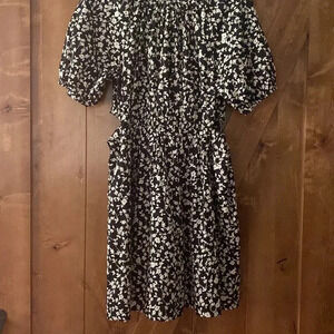 Black with white floral pattern. Puff sleeve with elastic. Side cut outs. Elastic waist. Size large. Has pockets. Never wore other than to try on.