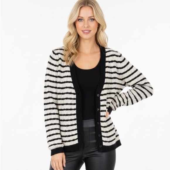 Stylish black and white striped sweater. Features button-up front. Comfortable and chic design.