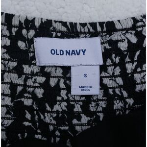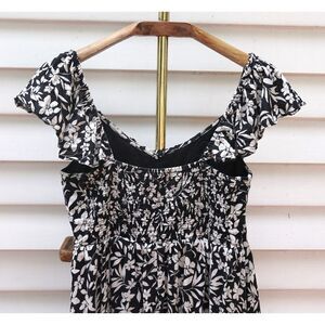 - Cute and flattering black and white floral tropical print fit n’ flare lined knee length dress with round ruffle edge neck, can be worn off the shoulder, by Old Navy
