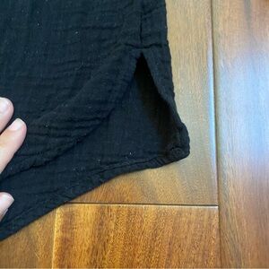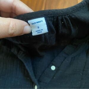 The Old Navy blouse is a women's small black flowy half-button shirt made from a comfortable cotton blend knit fabric. This V-neck tunic features long balloon sleeves and a pullover closure, making it perfect for casual occasions in the summer, fall, or spring. The classic solid black color and American theme add a timeless touch to this lightweight and easy-care blouse from the well-known brand Old Navy. Ideal for regular sizing and easy to care for with machine washable instructions, this top offers a stylish and versatile option for everyday wear.