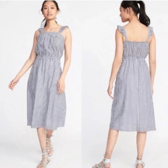 Old Navy Blue Chambray Linen Stripe Smocked Ruffle Strap Sleeveless Midi Dress - Beautiful summer sundress! Ruffle straps that are adjustable and can be worn straight or crossed. Blue and white chambray striped midi dress with a cinched, elasticized waist and adjustable ruffle straps that can be worn regular or with a criss-cross back. Fully lined from the waist down.
