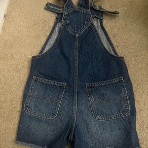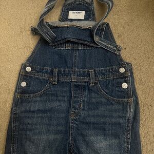 These blue denim overalls from Old Navy feature a classic design with a medium wash, offering a timeless look. The woven texture and indigo blue wash provide a traditional denim feel, making them a versatile addition to any wardrobe.