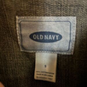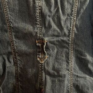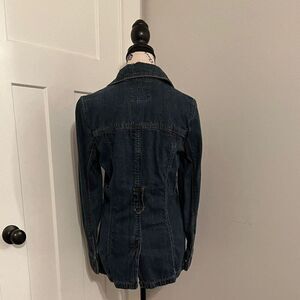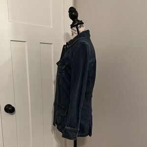 This jacket is longer and has snaps down the front. There are belt loops as well. Excellent condition.