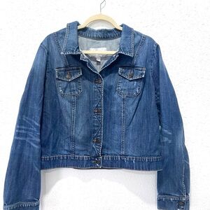 a pre-owned classic women's blue denim jacket, likely in the trucker style.