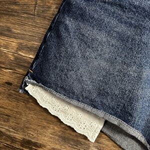 These Old Navy jean shorts feature a classic blue hue with a high-waisted design and rolled hems for a stylish look. The medium-dark wash and subtle fading add a touch of vintage charm, making them perfect for casual outings. Crafted from durable denim, they offer both comfort and style.