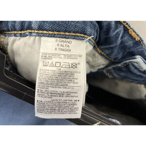 The product is a pair of Old Navy Blue Jeans in size 8 tall with a high rise and a straight style. Made of denim with a comfortable stretch fabric, they feature a button fly and a raw hem. These jeans have a classic 5-pocket design and are perfect for the winter, fall, and spring seasons. Machine washable and made in Pakistan, they offer a regular fit for a flattering and comfortable look.
