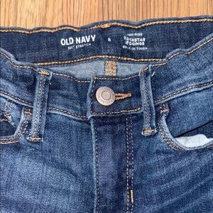 These Old Navy skinny jeans in a classic blue hue feature intentional distressing for a modern, casual vibe. The medium-dark wash and subtle fading offer a slightly worn-in look, while the stretch denim ensures a comfortable fit.