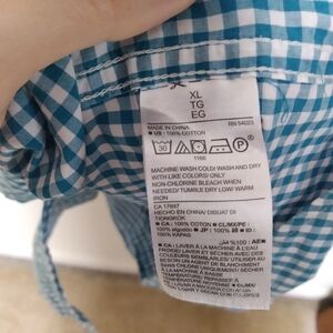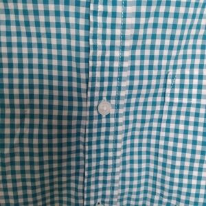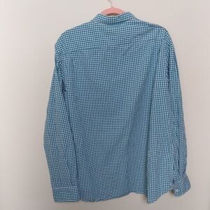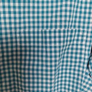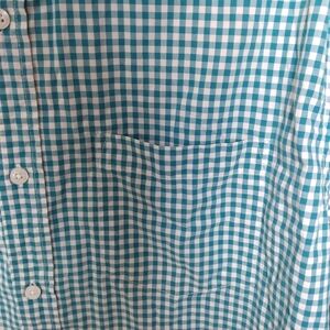 Old Navy teal blue and white gingham plaid regular fit classic long sleeve button down 100% cotton shirt with breast pocket