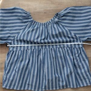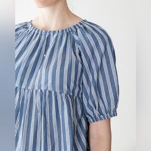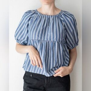 Stylish blue blouse with white stripes. Features puff sleeves and gathered neckline. Ideal for casual wear. 100% cotton