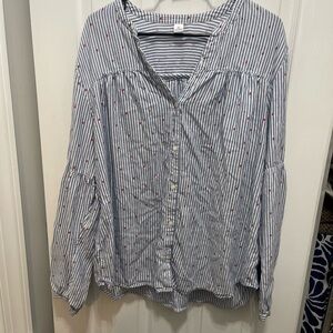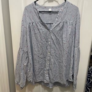 Chic blouse with blue and white stripes. Features red dot accents. Ideal for casual wear.