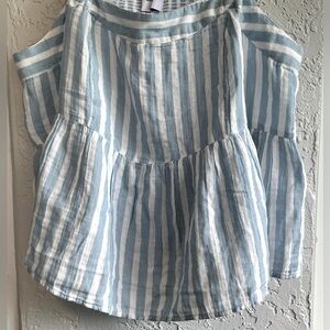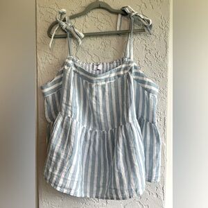 Chic sleeveless top with blue and white stripes. Features tie straps and a flowy design.