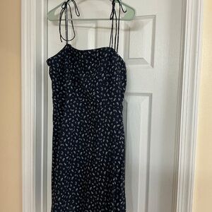 Old Navy blue and white sundress, size large. Color: navy blue with small flowers, thin straps that tie, and dress hits mid thigh. Perfect for a summer picnic! Never worn, but tags removed.