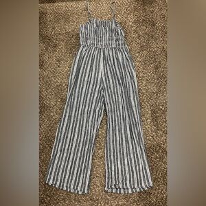 Blue and white striped linen blend, wide leg jumpsuit with smocked waist. Light and breathable fabric, adjustable straps, smocked waist and pockets!!