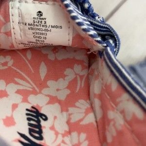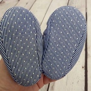 These soft-soled crib shoes from Old Navy are designed to look like an adorable pair of blue and white striped loafers with pink accents. SO cute on your baby when they're out and about. Easy-on and off, as well. Slight yellowing inside. Like new condition.