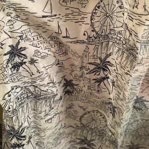 Label says this is a classic-fit button-down shirt. White with all-over summery boardwalk print in navy blue. Never worn and NWT! Item comes from smoke-free environment.