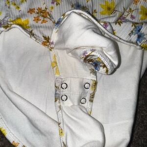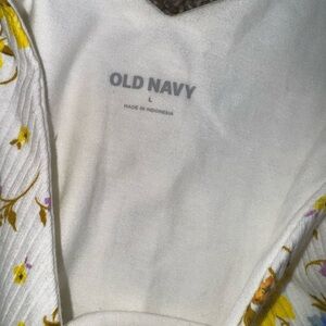 This is an Old Navy Women's White Colorful Floral V-Neck Bodysuit. It features a V-neckline, tie-shoulder straps, and a floral pattern. It is made of a cotton blend knit fabric and has a regular fit.