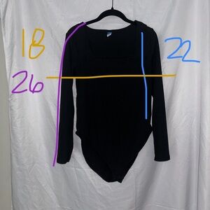 This sleek black bodysuit from Old Navy features a fitted design with long sleeves, offering a streamlined silhouette. Crafted from a smooth, stretchy fabric, it provides both comfort and style. Perfect for layering or wearing on its own, this versatile top is a wardrobe essential.