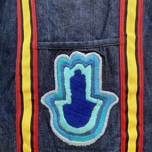 Very cute, Old Navy summery, boho, denim tote bag with ribbon double handles. Front has an open pocket. Beautiful boho embroidered design on pocket flap. Very clean lining. Lining has same striped pattern that is on the handles but in a graphic. Tag has slight red dots from graphic inside. Rest of the bag is flawless.