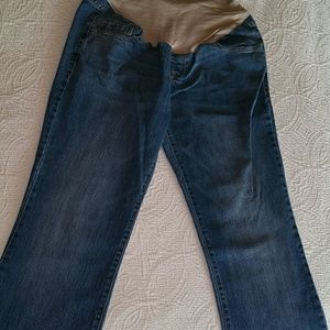 Great pair of maternity jeans in a lighter (more casual) denim color with full tummy panel. There is a small stain on right side of tummy panel, otherwise no holes or stains. 32" inseam.