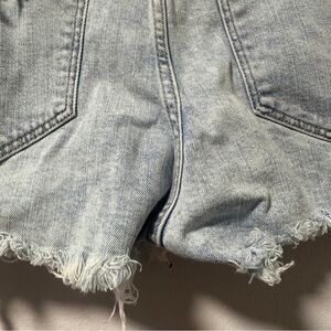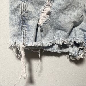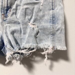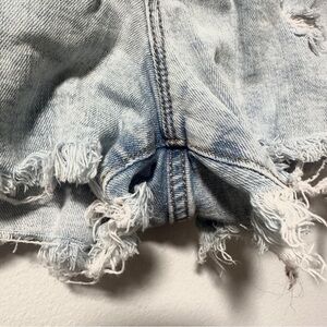 Old Navy Boyfriend light wash distressed denim raw hem shorts. Classic 5-pocket style cutoffs, zip fly, button closure, belt loops, short length. Pre-owned in very good condition, no stains, mark through brand name on inner hem but doesn’t effect wear.