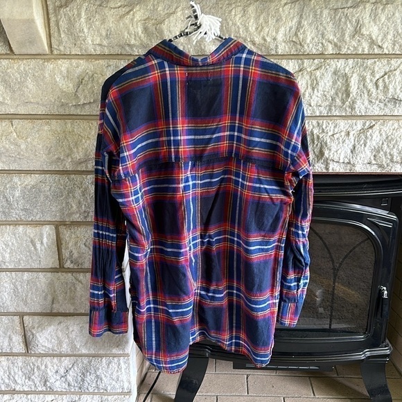 Excellent used condition! Great plaid color pattern in blue, red, yellow, and white with the blue being a lighter blue and a navy blue. Buttons halfway down and is higher in the front than it is in the back. Two front pockets that are functional. Measurements armpit to armpit, about 21 inches, front length about 26 inches, and back length about 30 inches.